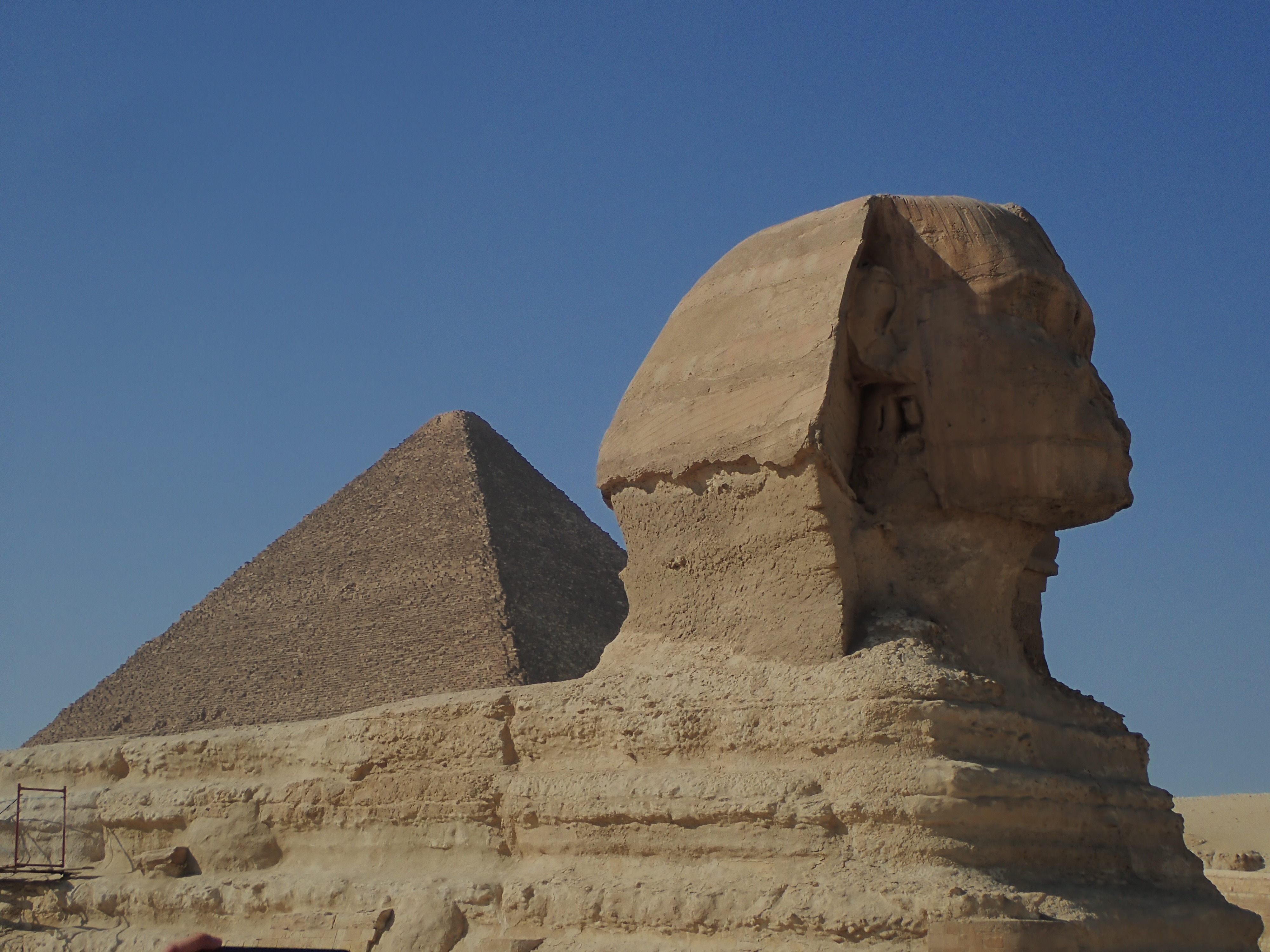 Ensuite nous nous sommes rendus aux pyramides et au Sphinx de Gizeh, étonnamment proche du Caire. Nous avons été surpris par le peu de fréquentation. Nous avons pénétrés sous la pyramide de Hétep-Hérès I qui est inclut dans le prix du billet. Attention c’est déconseillé aux personnes claustrophobes et nous comprenons pourquoi, il faut se plier en quatre pour prendre les escaliers. Nous avons aussi décidé de payer en plus pour le ticket permettant de rentrer à l’intérieur la fameuse pyramide de Khéops, la seule où le tombeau était au milieu et non en dessous. Une chouette expérience qui demande un certain niveau physique (plus difficile que celle de Hétep-Hérès). Après un long moment à grimper en position accroupie nous sommes arrivés dans des chambres complètement vides (même pas un panneau pour nous féliciter du chemin parcouru). Nous avons alors pleinement apprécié le sens du dicton : « l’important, ce n’est pas la destination, mais le voyage ». Quelle aventure de rentrer dans ces lieux vieux de près de 5 000 ans !