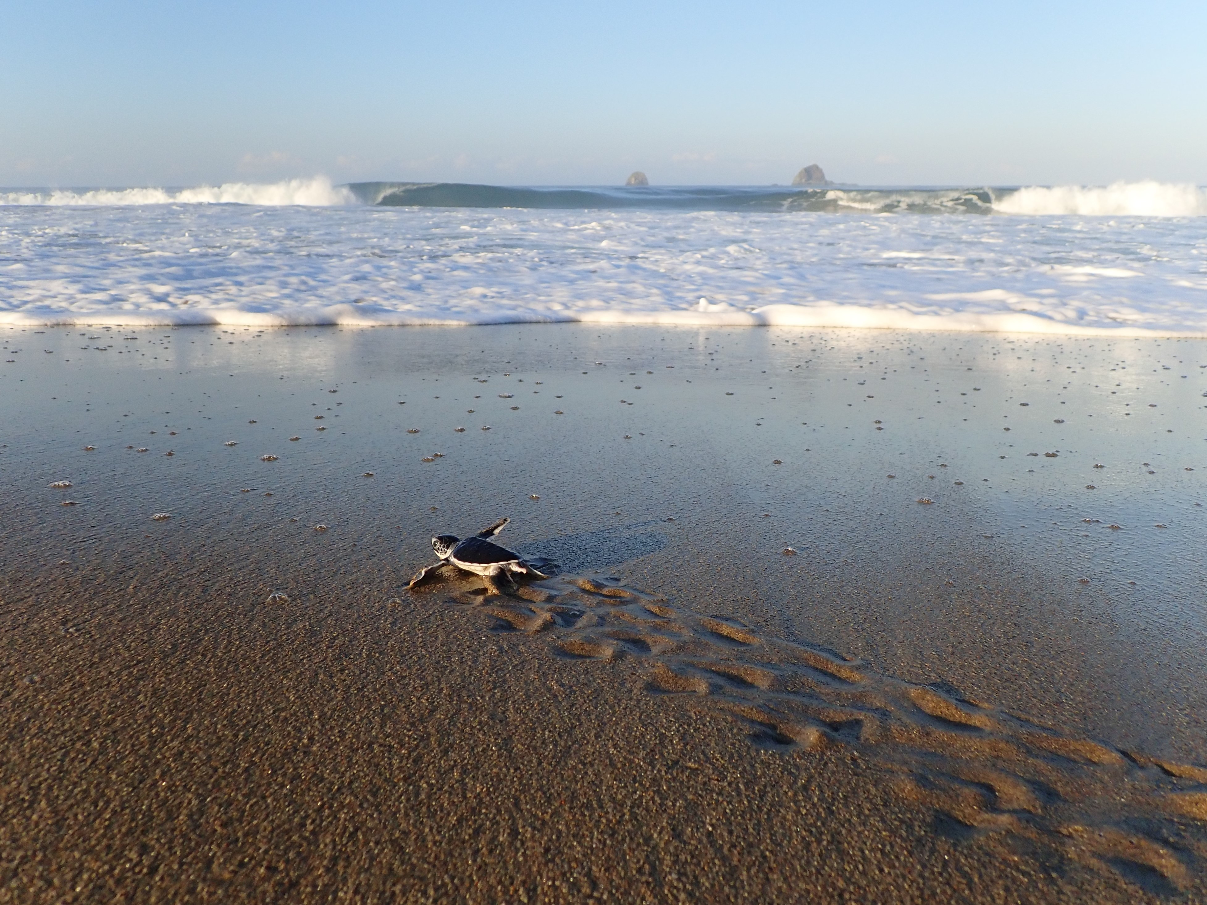We rested for a few hours before setting off again at dawn to release baby turtles (which were a few weeks old). We released our six turtles one by one (five green turtles and one olive ridley turtle). Our olive ridley turtle, smaller than the others, had a hard time getting to the sea. Once we got them out of the bucket and on the beach we were instructed not to touch the turtles again. So we anxiously watched her go in the wrong direction and get constantly swept back by the waves. Finally our little turtle, renamed Franklin, managed to get to sea. Some of our turtles were still sticking out their heads and a little paws here and there as if to say a last goodbye before we lost sight of them.