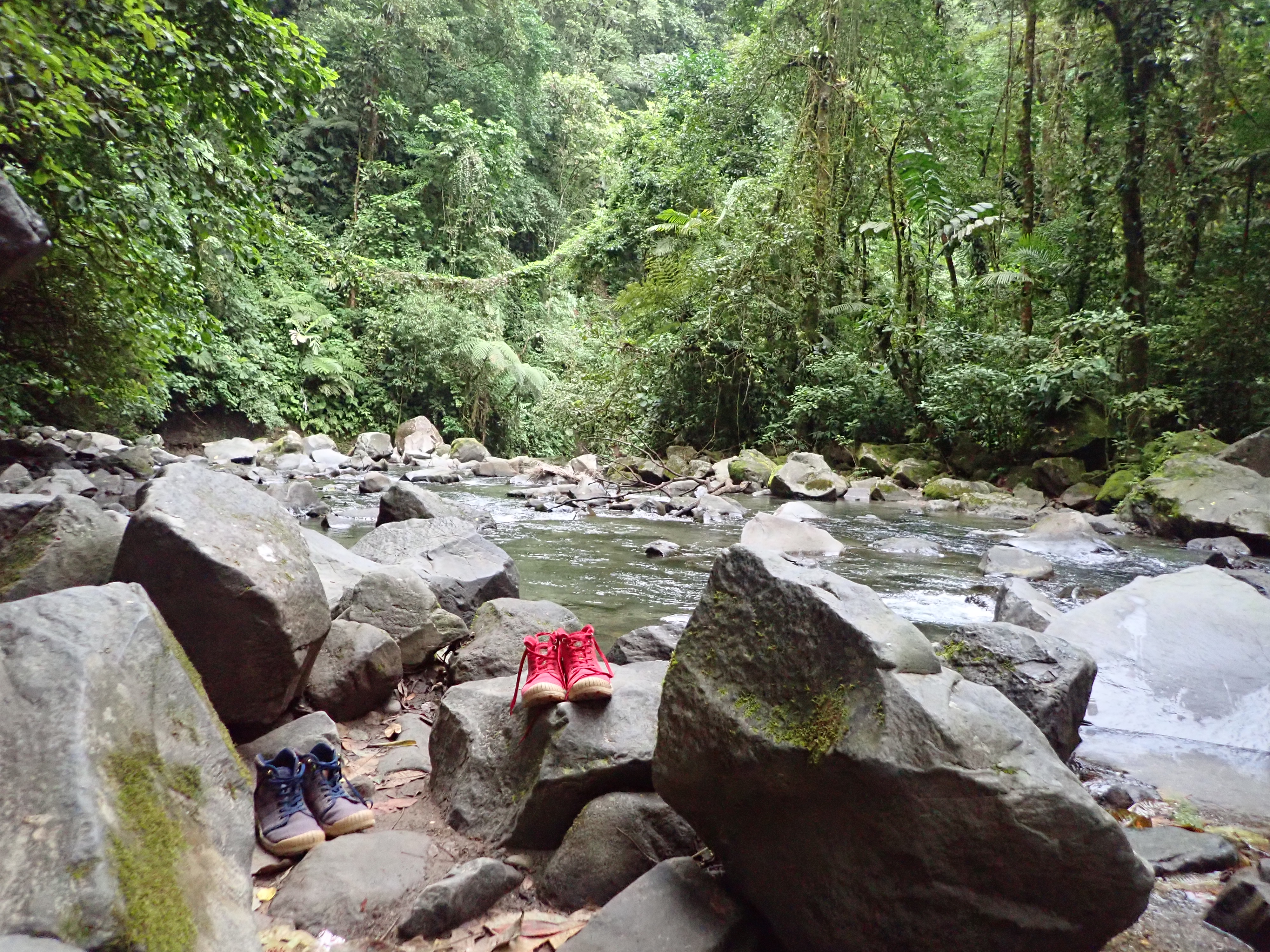 After dropping our luggage, we went for a swim in El Chollin hot springs. Although it was not recommended by our host due to regular robbery (to avoid at night especially), we had a relaxing time with the many locals and tourists in this thermal river naturally at 35 °C / 90 °F. The main advantage of this activity is the price (free!), but because of the excessive number of people we found there was a lot of garbage on the river banks. It is also possible to stop in one of the many hotel & spa facilities (relatively expensive) using these hot water springs. After this we also swam in the cold (or rather non-thermal) waters of Del Salto – Río Fortuna. You can have fun jumping in the water there with a rope.