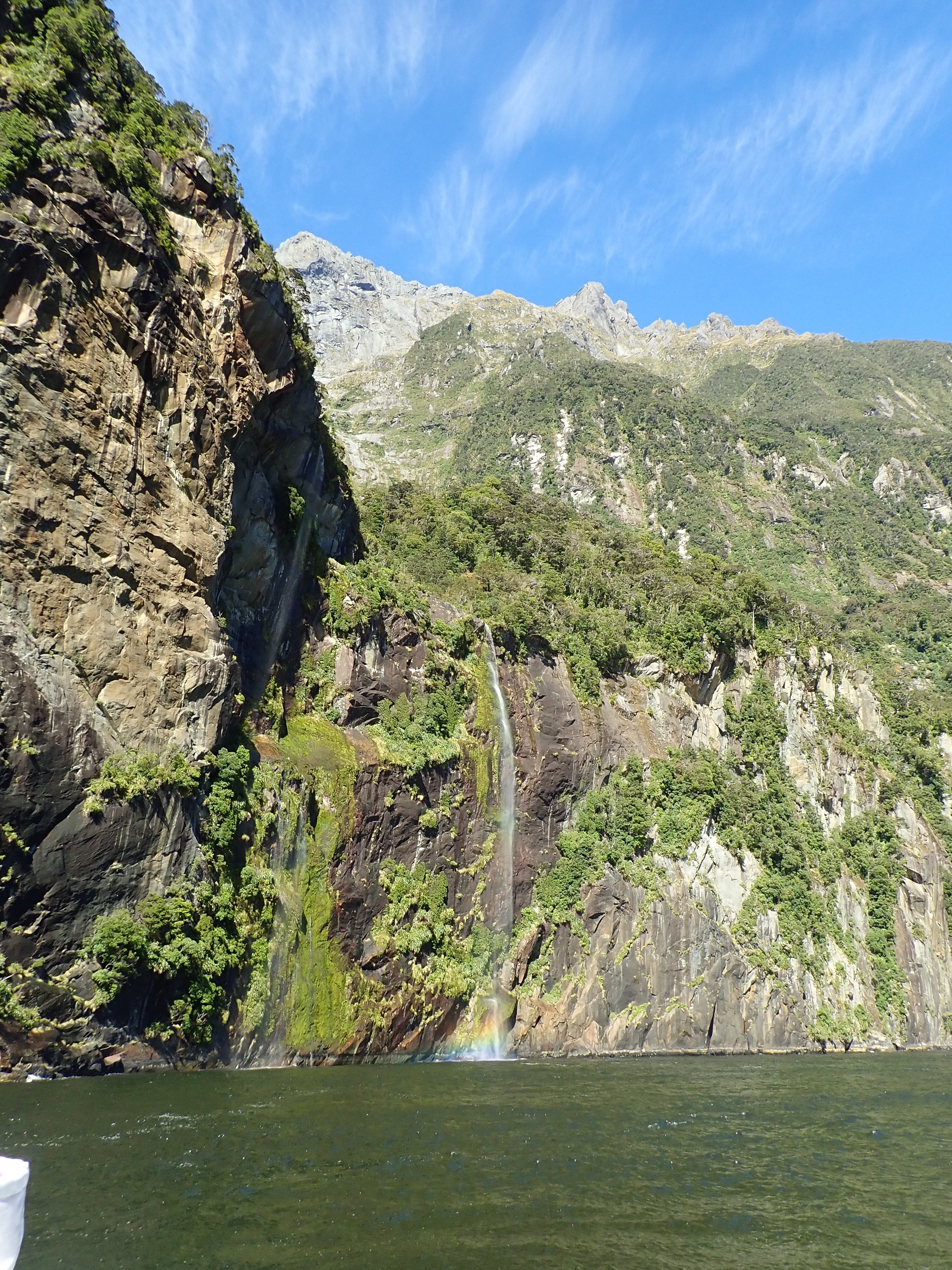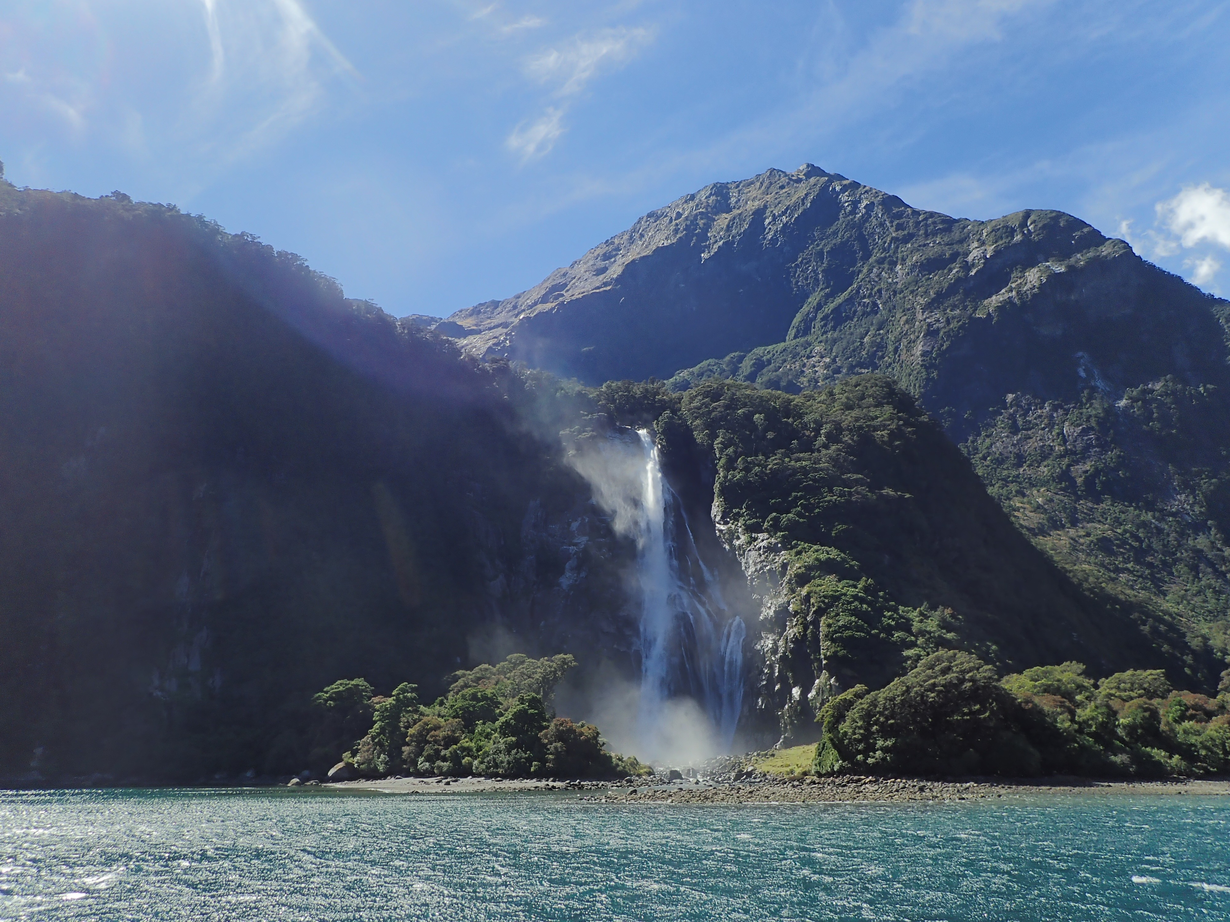- 2-hour cruise with Cruise Milford including tea, coffee and biscuits on board. The boat approaches the waterfalls and it is possible to stay outside for a mini shower and to drink the water! In addition to the beautiful scenery, we were able to observe some seals.