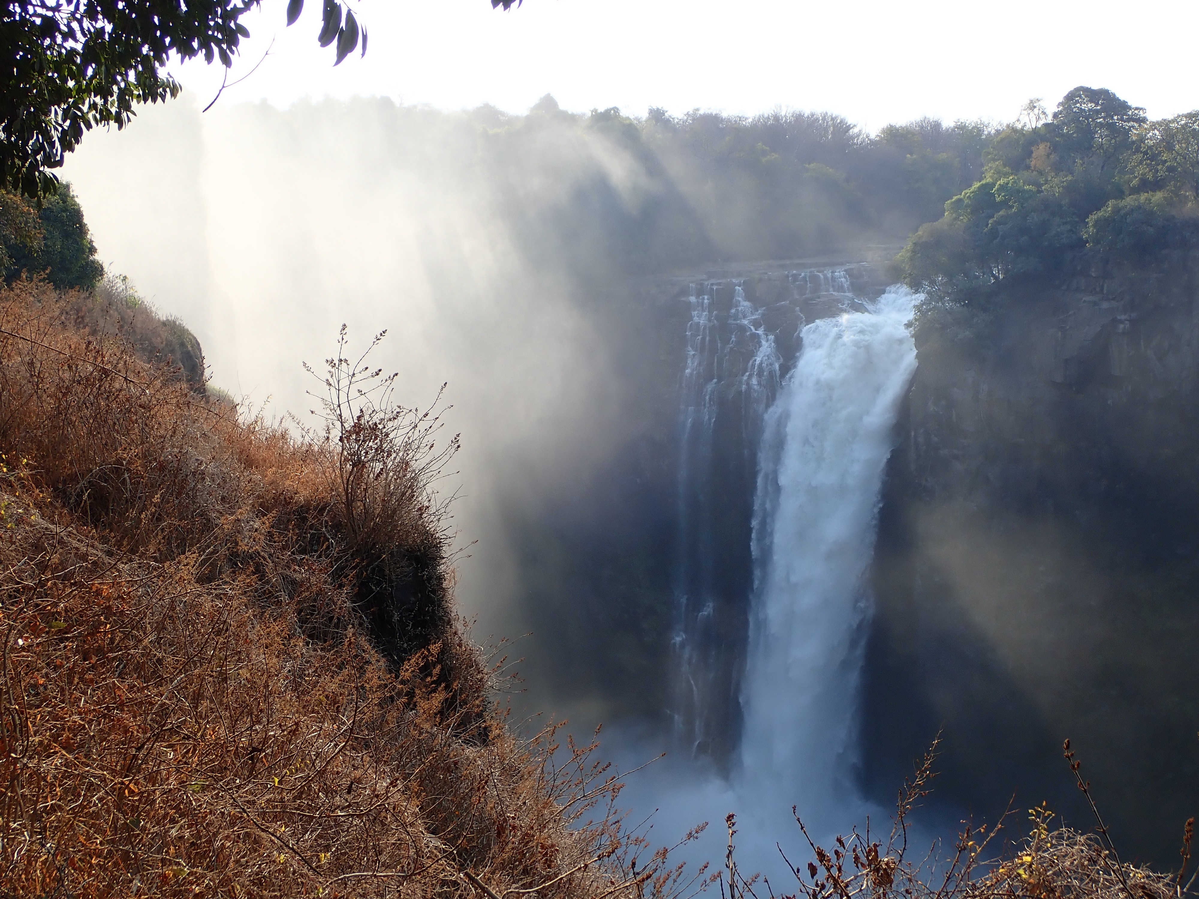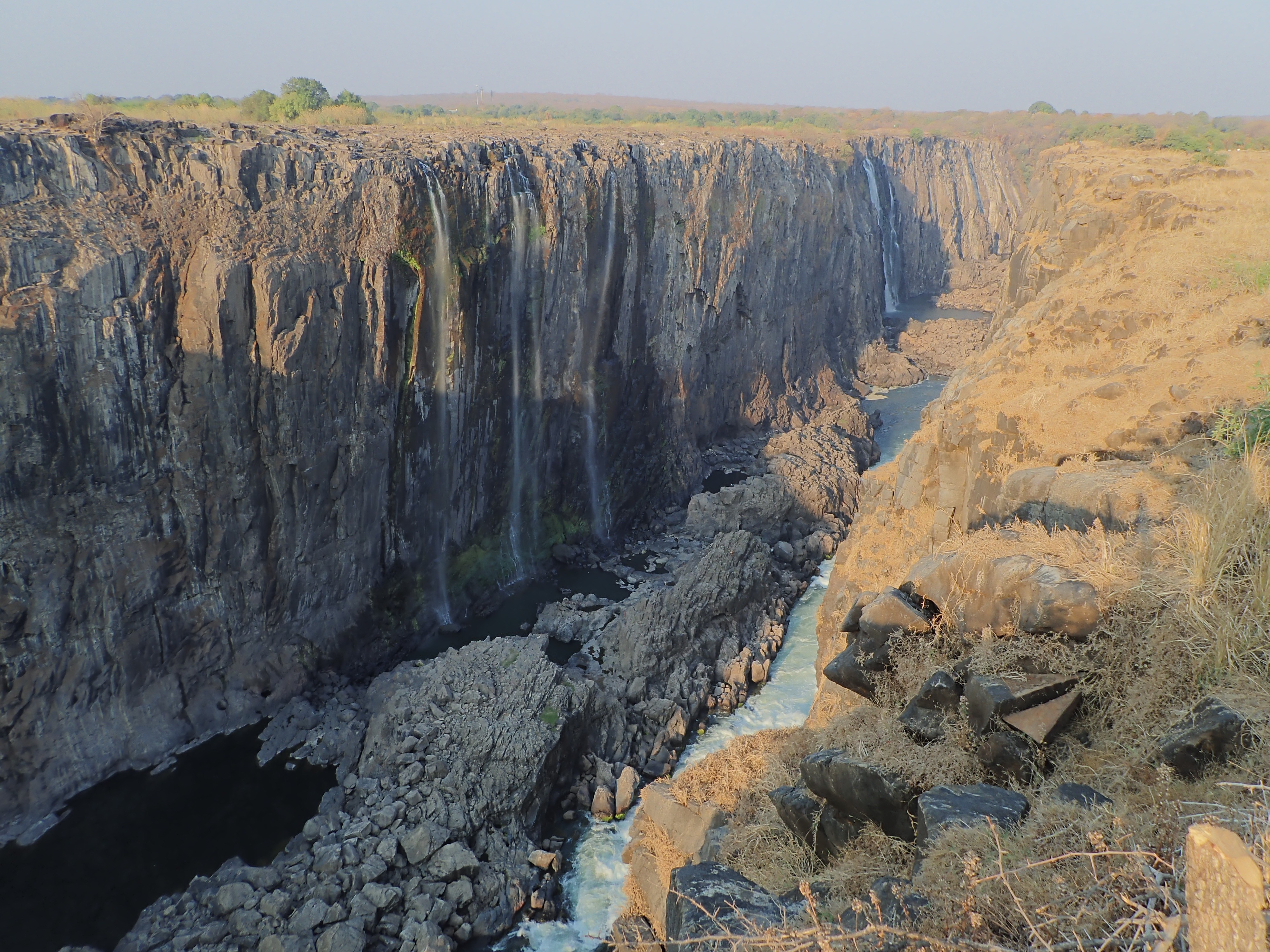 Victoria Falls, also known as “Mosi oa-Tunya” (“the smoke that thunders”), is positioned almost exactly half way along the Zambezi River’s 2700 km journey from it’s source to the sea. The Victoria Falls is the biggest curtain of falling water in the world. It is approximately 1700 m wide, and varies in height from 80-108 meters. Around mid-April is when peak flood waters occur. During this time, roughly 625 million litres of water flow over the edge per minute.