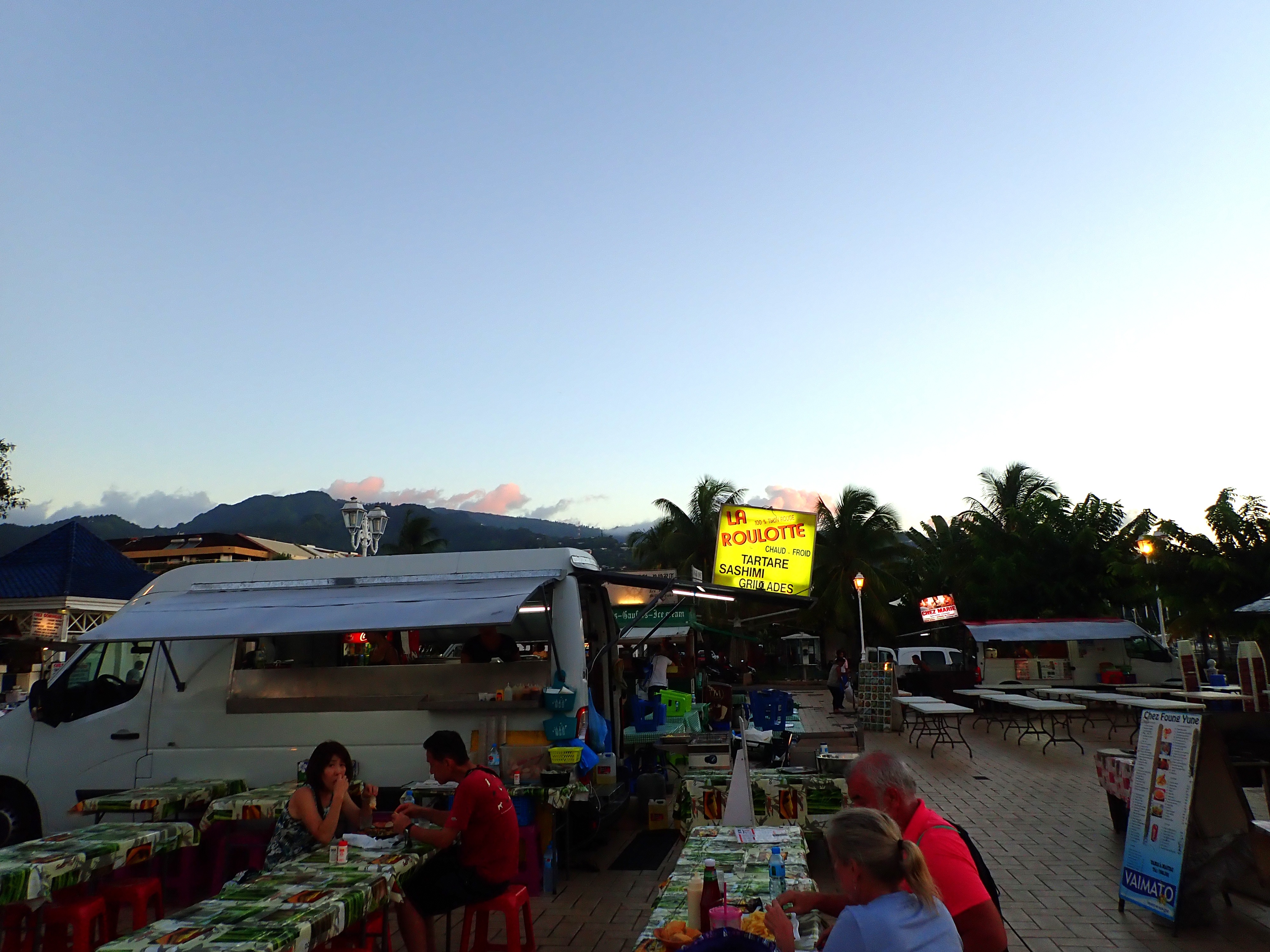 Le soir, à partir de 6 heures, il faut absolument vous rendre à la place Vai’ete pour goûter les délicieux mets locaux des roulottes. Un excellent repas abordable avec vue sur l’océan. Pour Clémentine se fût un tartare de thon sur lit d’ananas et de crevettes et pour Nicolas du poisson cru au lait de coco.