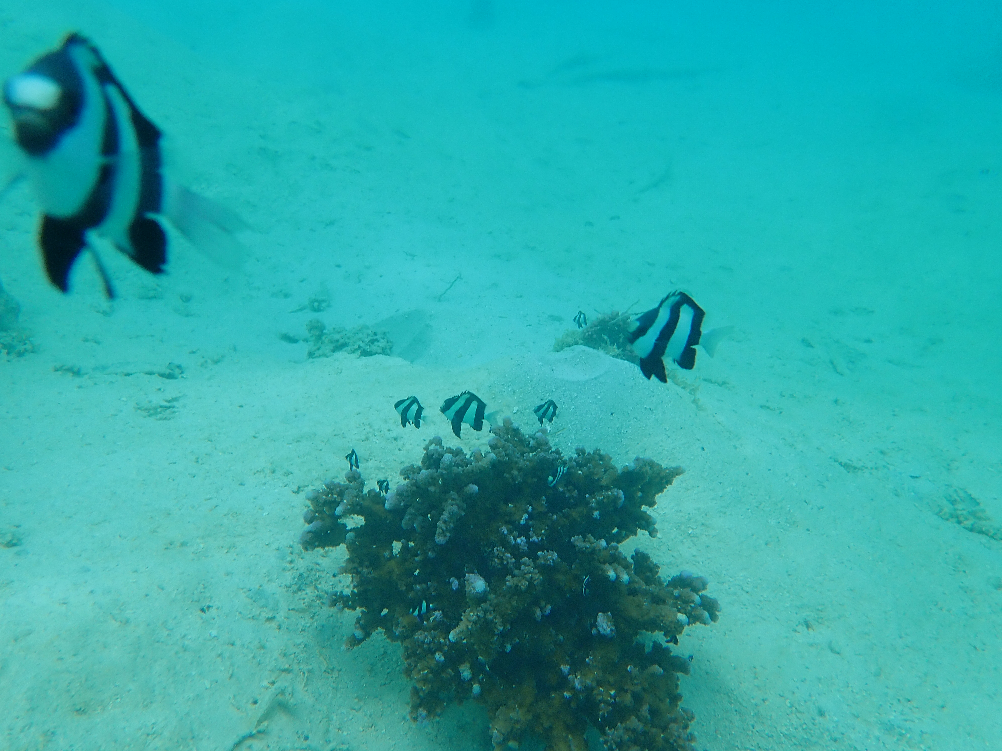 Grâce au kayak disponible à la pension Tupuna nous avons pu nous rendre à la plage abandonnée de l’ancien Sofitel. Premier arrêt de notre expédition au large du Motu Vaiorea pour faire du masque et tuba (aussi prêté par la pension) dans le jardin de corail. Nous croisons même quelques petits requins à pointe noire.