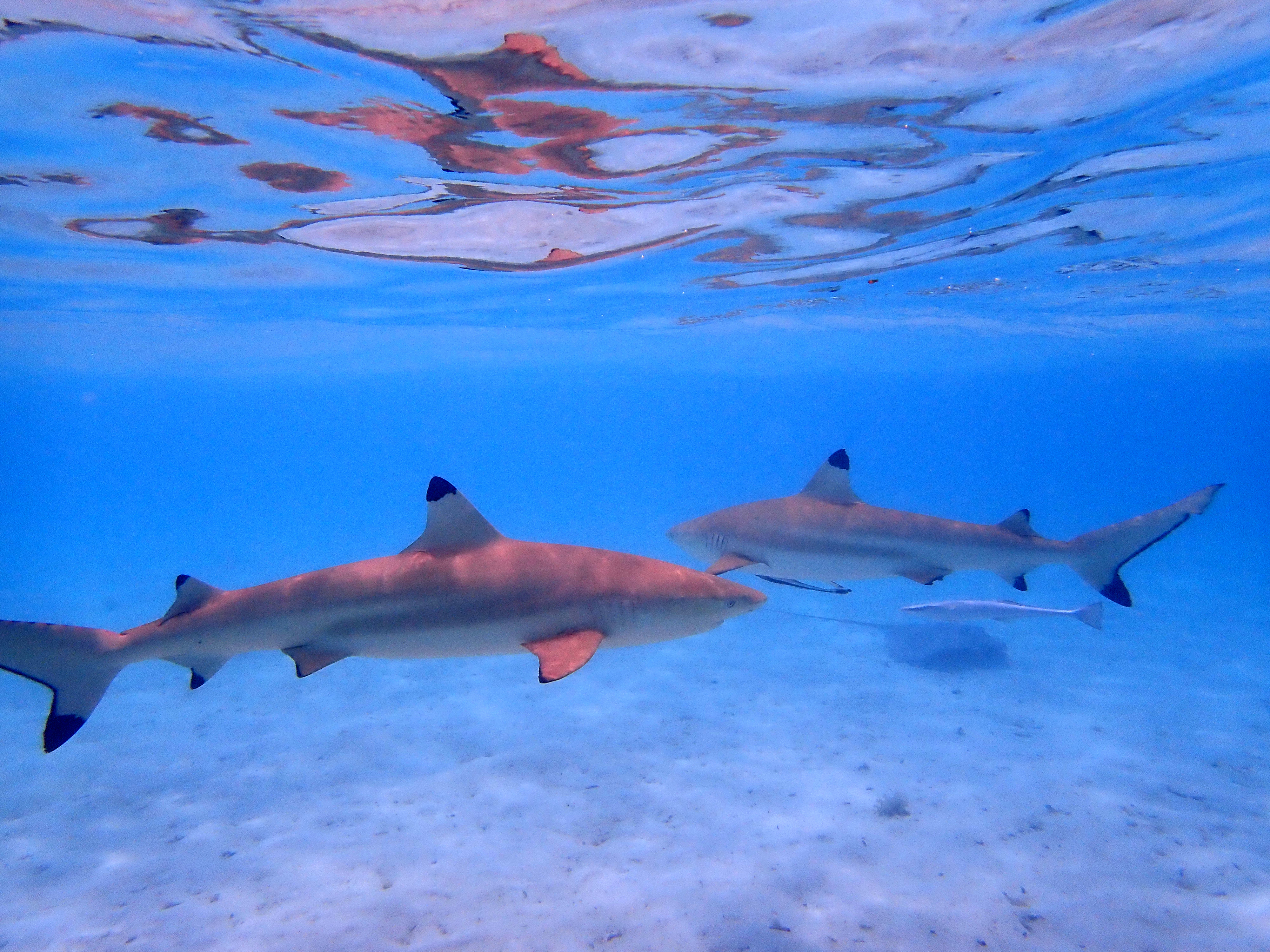 Ensuite, nous déjeunons dans le lagon avant d’aller nager avec les requins et les raies. Nous avons spécifiquement demandé au capitaine de ne pas les nourrir et tout se passe bien jusqu’à ce qu’un autre bateau vienne et les appâtent. Les requins et les raies ont commencé à s’affoler et à passer à quelques centimètres de nous. C’est très impressionnant et nous n’étions pas totalement rassurés. Le souvenir restera gravé dans nos mémoires à jamais ! Nous faisons ensuite le tour de l’île observant ainsi les différents tons turquoises du lagon et les habitations sur pilotis des hôtels de luxe (qui ne nous rendent pas jaloux du tout !). Nous jetons l’ancre entre l’île et l’atoll.