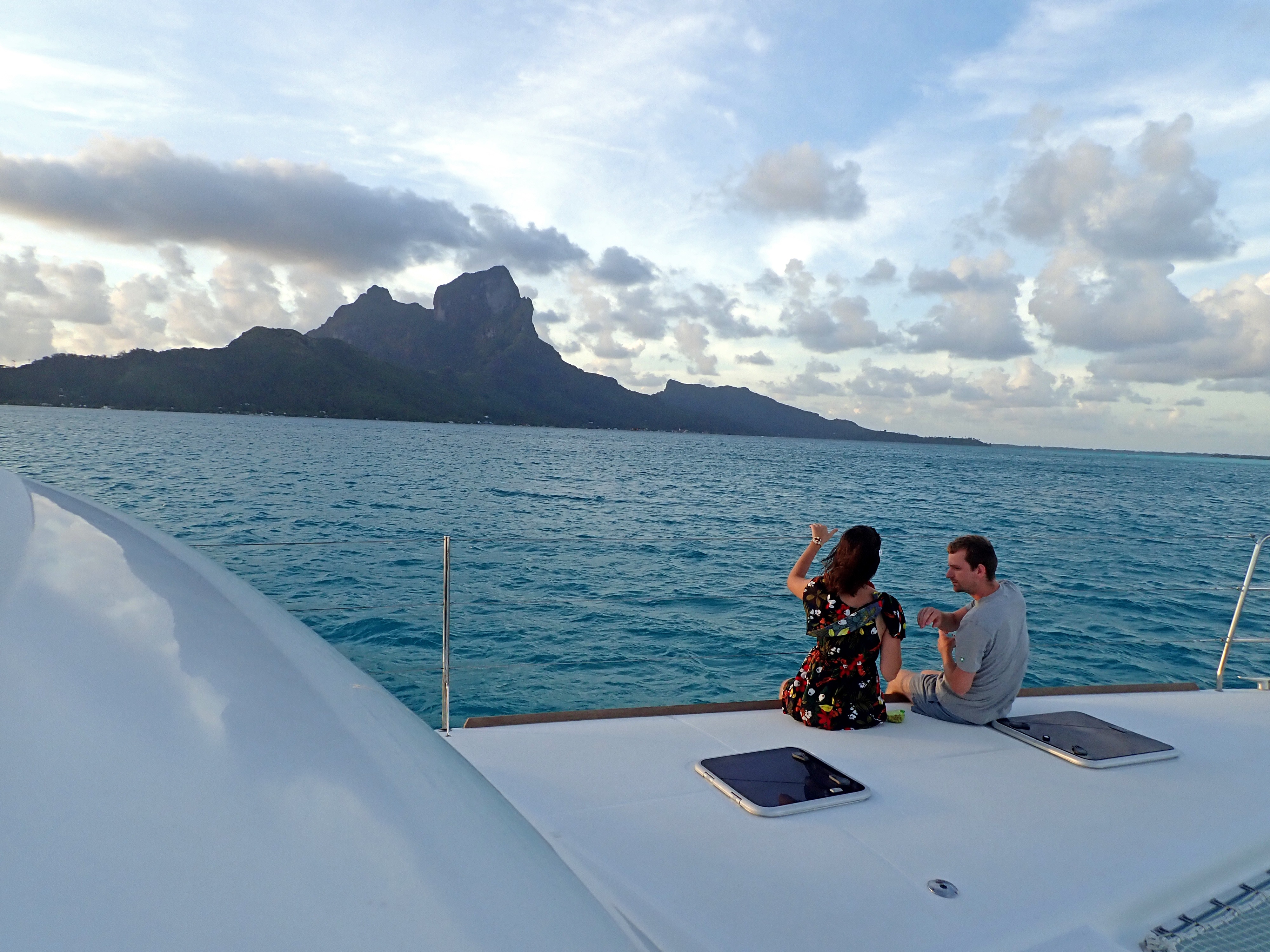 Plutôt que de prendre d’autres vols nous nous sommes laissés tenter par l’expérience d’une croisière en catamaran avec Dream Yatch Charter entre les îles de Raiatea et Bora-Bora. Absolument extraordinaire et bon marché en considérant que le prix comprend nos transports, notre logement, tous les délicieux repas (goûter compris), les points de vue les plus incroyables et des activités nautiques à n’importe quelle heure.