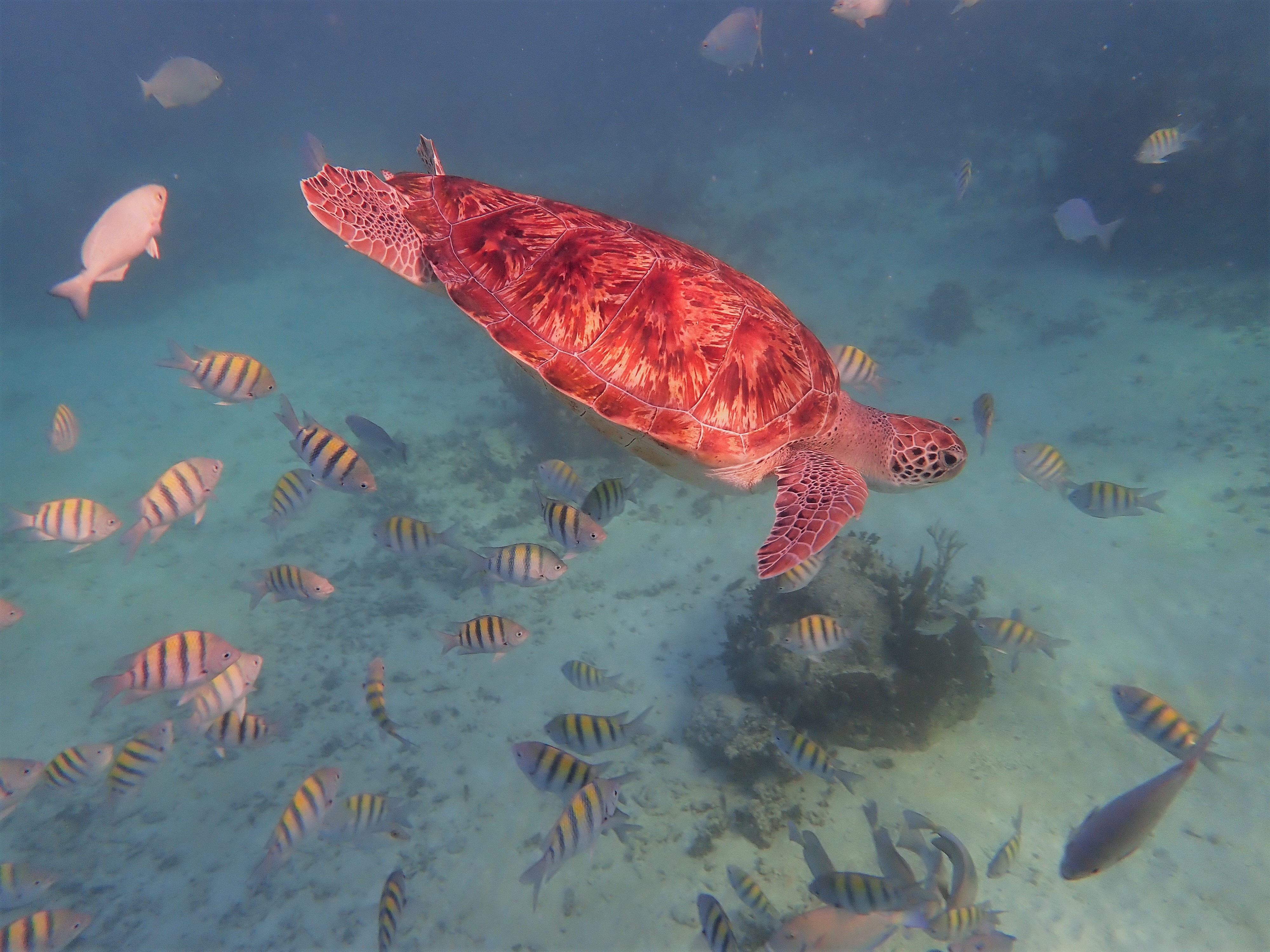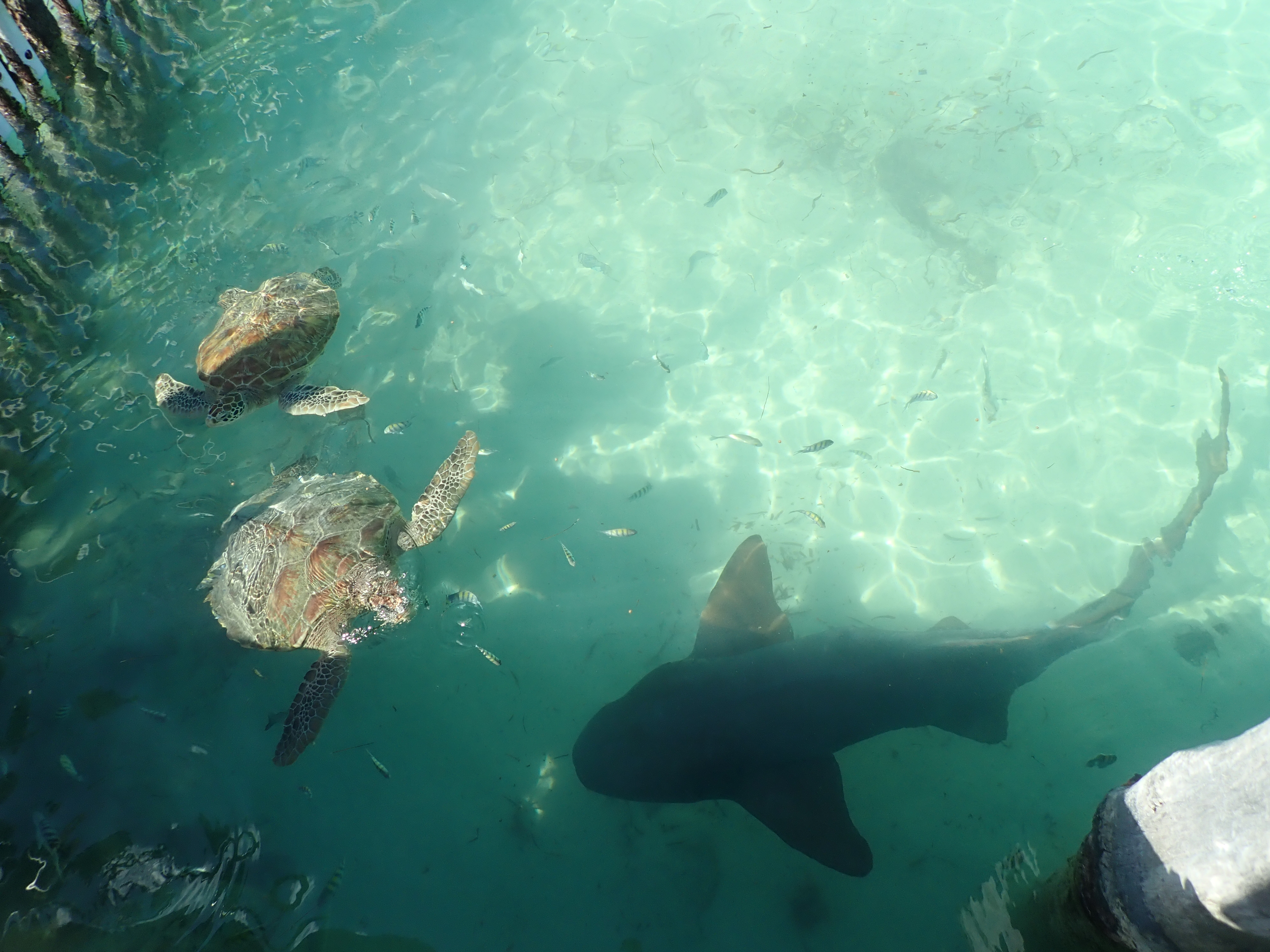 Nous souhaitions faire un tour de snorkeling sur le récif de l’île et au musée aquatique. Ce musée cherche à démontrer la coexistence entre l’art et les sciences de l’environnement. En effet, avec le temps, la vie marine trouve refuge dans les statues et le corail s’y forme. Nous avons opté pour un tour avec la coopérative isla mujeres tours et avons été un peu déçu, le repas inclus n’était pas très bon et l’équipement mauvais. En plus, les poissons ont été nourri au début de l’excursion, un geste inutile et nocif. Le tour nous a cependant permit de nous arrêter à la merveilleuse ferme à tortues Tortugranja. C’est ici qu’ils récoltent les œufs après la ponte afin de maximiser les chances (très infimes, surtout avec les activités sur la côté) de survie des bébés tortues et empêcher le braconnage. Vous pouvez donc y observer trois races de tortues locales à différents âges jusqu’à ce qu’elles soient assez mature pour être relâchées dans la mer. Nous avons adoré cette visite où nous avons aussi vu des requins. L’entrée ne coûte que 30 pesos. Nous nous sommes ensuite baladés le long des jolies plages, notamment la Playa Norte au nord de l’île près du port du ferry.