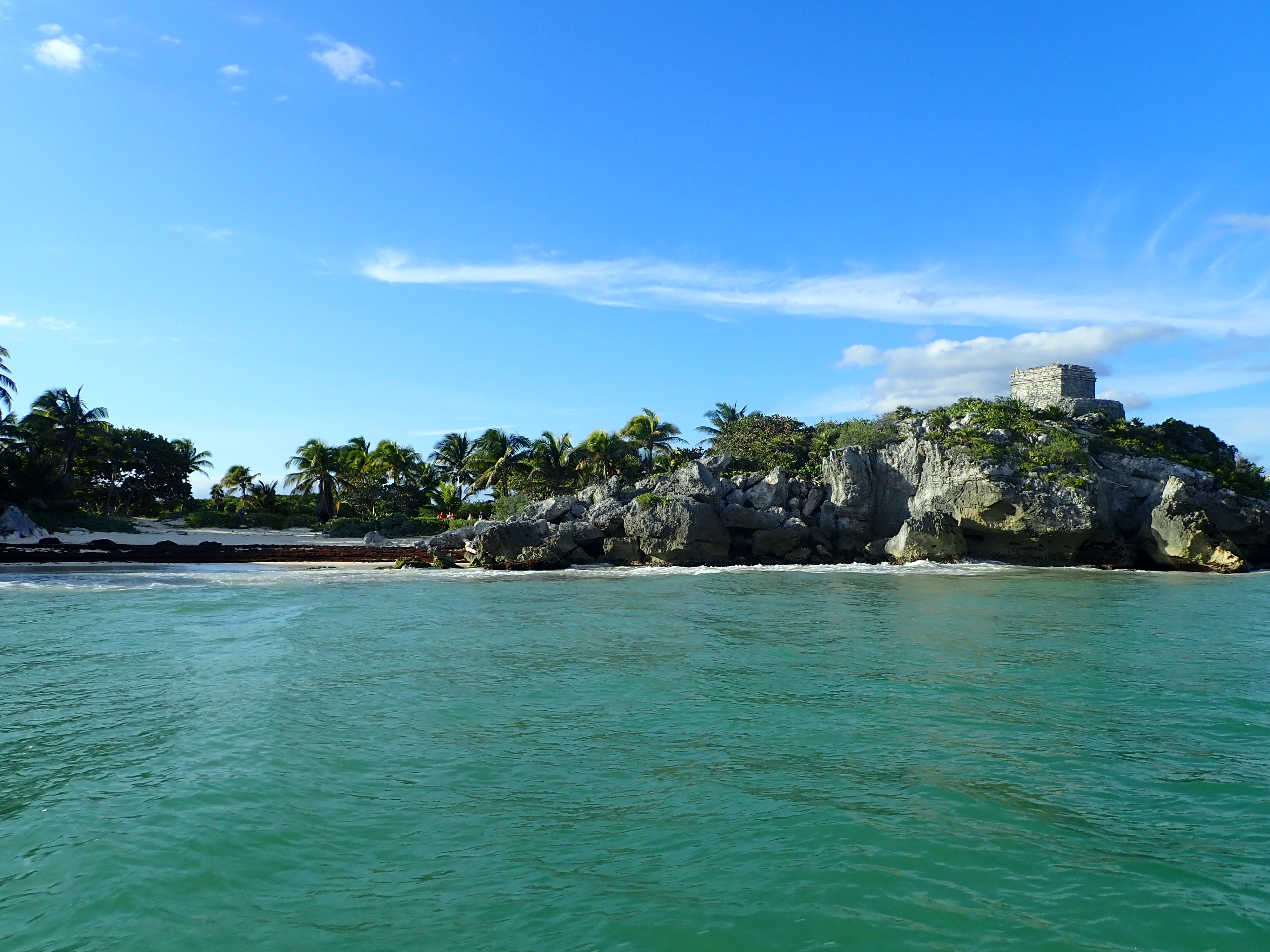 À Tulum, il ne faut pas manquer de visiter les ruines Mayas qui offrent un cadre très différent des autres ruines de la région. En effet les ruines sont perchés sur le bord de la mer. C’est très facile de se rendre aux ruines en colectivos (mini bus / taxis partagés). Il suffit d’embarquer dans le premier venu depuis la route principale et d’avoir sa monnaie prête. Nous nous sommes laissés tenter par une ballade en bateau (achetée juste avant l’entrée du site archéologique) pour observer les ruines depuis la mer, cela valait vraiment le coup et offre une superbe vue d’ensemble. Le tour en bateau comprend aussi une nage avec masque et tuba sur la barrière de corail parmi de nombreux poissons ainsi que des raies et tortues ! Nager avec des tortues étaient un rêve pour nous mais nous avons été dérangés de voir que certains bateaux les nourrissaient. C’était aussi un petit lieu tellement remplis de touristes que nous avons dû nous débattre un peu et nous nous sommes pris des coup de palmes dans la tête.